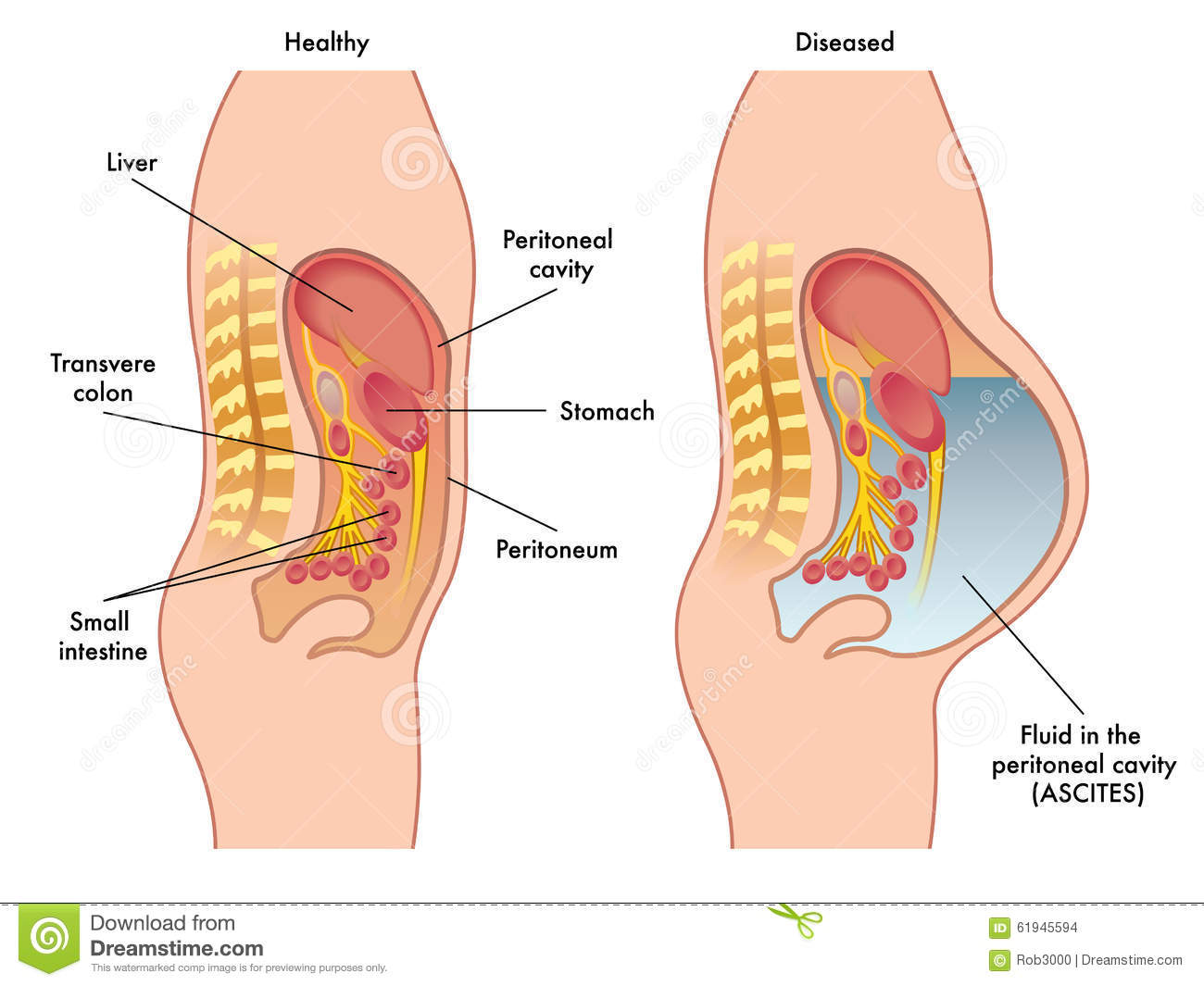 La ascitis es la acumulación excesiva de liquido peritoneal. Esta puede deberse a un desequilibrio entre la presión al interior de los vasos sanguíneos y la cantidad de proteínas que se encuentren en la sangre, favoreciendo la salida y acumulación del trasudado peritoneal. También puede deberse a un daño o inflamación del peritoneo como tal a consecuencia de procesos infecciosos (exudado) u otros factores.