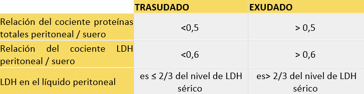 Para clasificar al líquido peritoneal en trasudado o exudado se utilizan el cociente de proteína total y el cociente de lactato deshidrogenasa, también denominados como Criterios de Light